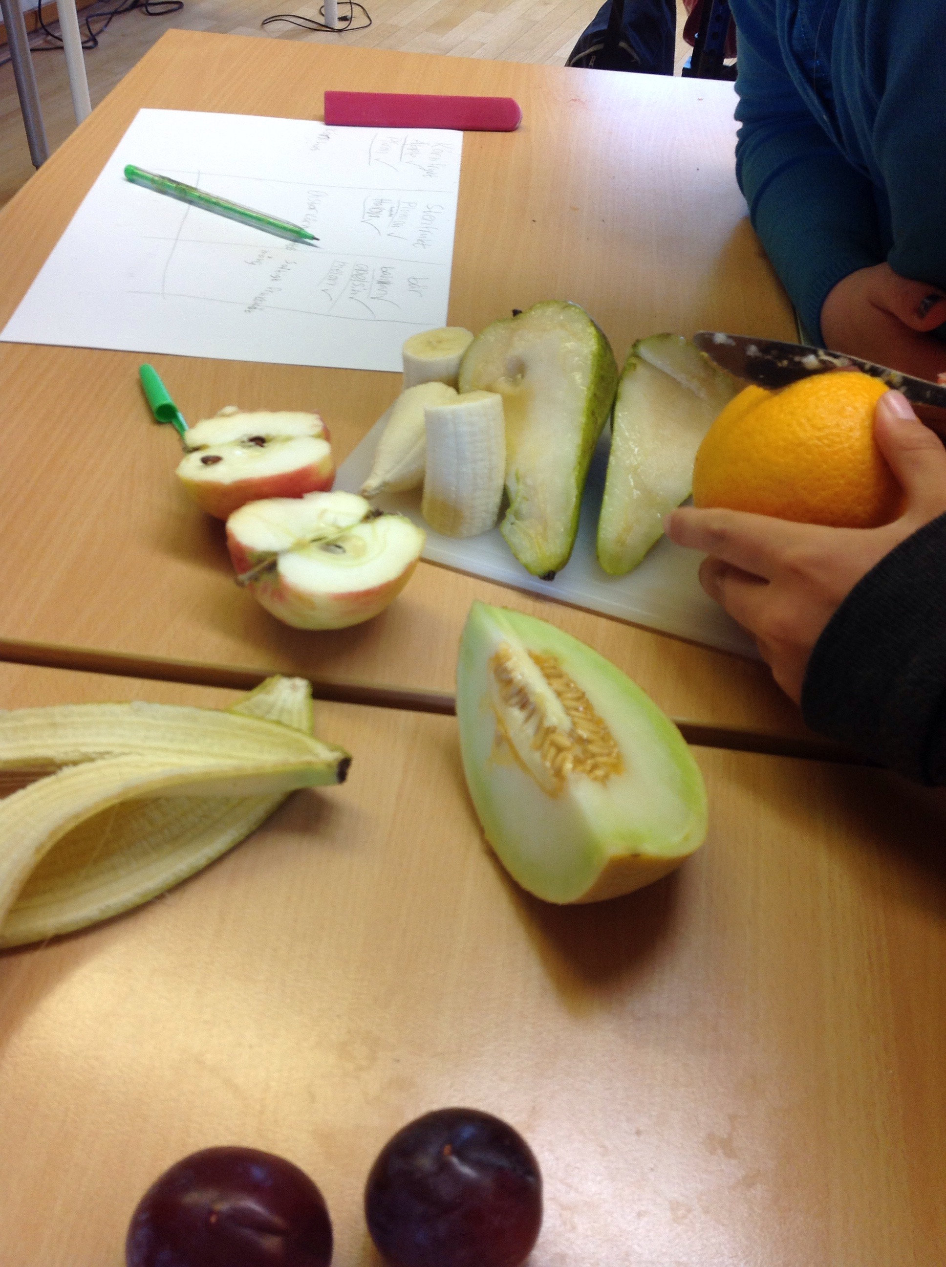 I klass 4 har vi idag kategoriserat frukterna banan, melon, hallon, äpple, päron, plommon och apelsin till grupperna kärnfrukt, bär och stenfrukt. I förra veckan tittade vi på film och pratade om vad som skiljde dessa grupper åt. Idag har vi arbetat praktiskt med det vi lärde oss då. Efteråt fick barnen leta efter fruktens kärna samt äta upp frukterna vilket var poppis.